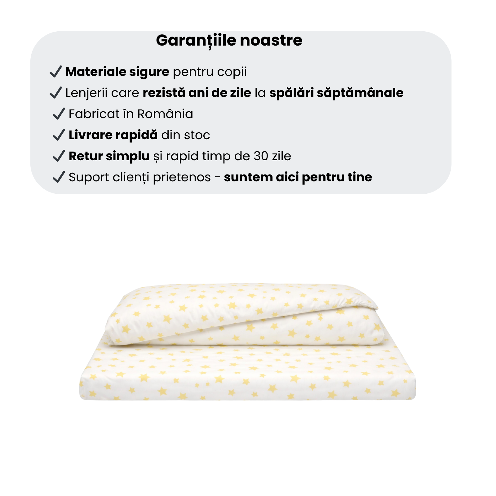 Modelul cu steluțe galbene pe fond alb este luminos și vesel, potrivit atât pentru fetițe, cât și pentru băieței. Nuanța caldă de galben aduce o atmosferă prietenoasă și optimistă, contribuind la crearea unui spațiu liniștitor și plăcut pentru odihnă.