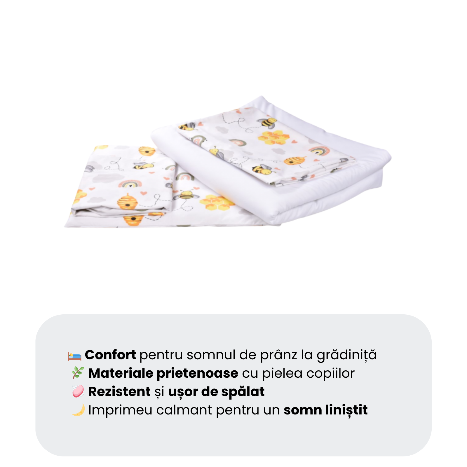 Modelul cu albinuțe vesele adaugă un aspect jucăuș și plăcut, îndrăgit de copii.Cearșaful este prevăzut cu elastic pe colțuri, ceea ce permite o prindere sigură pe saltea și menținerea lui bine întins în timpul utilizării.Îl poți alege ca rezervă pentru lenjeria copilului de la grădiniță sau îl poți combina cu o păturică pentru a crea un set practic și drăgălaș.