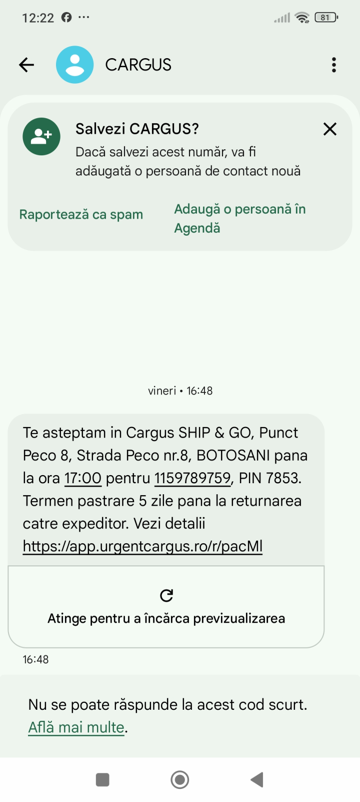 Bună ziua! Vineri cam după orele 17 a scris un mesaj curierul că pot ridica comanda de la agenția Cargus ...eu am stat toată ziua acasă și chiar nu am un apel de la ei...Sunt foarte dezamăgită ,bine nu de dumneavoastră ci de firma Cargus ...pt că nu avea timp sa mai lucreze dau ia fost lene