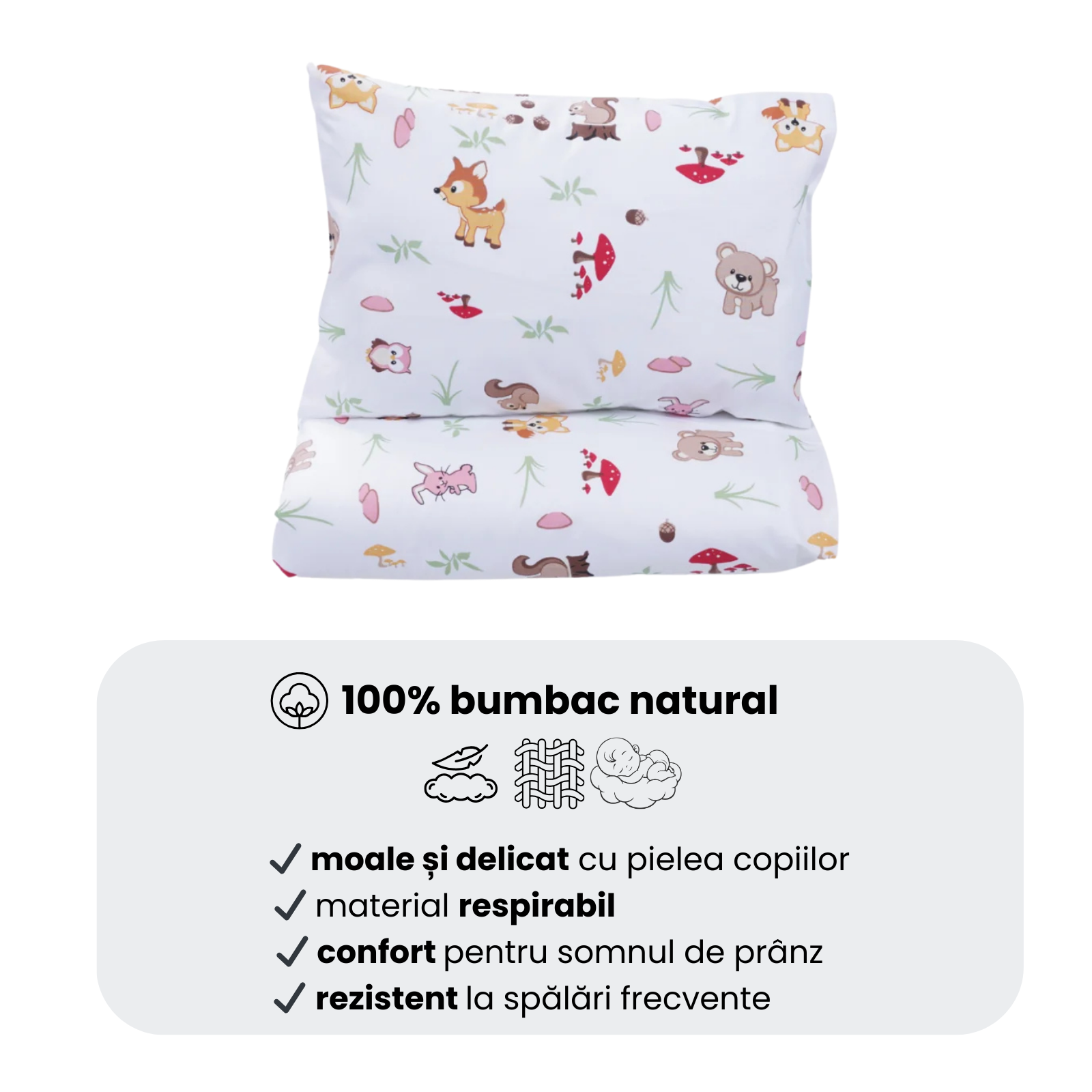 Cearșaful este realizat din bumbac 100%, moale, fin și plăcut la atingere, oferind copiilor confort și un somn liniștit. Materialul este dens, respirabil și delicat cu pielea sensibilă a celor mici, fiind ideal pentru utilizarea zilnică în grădinițe și creșe.
