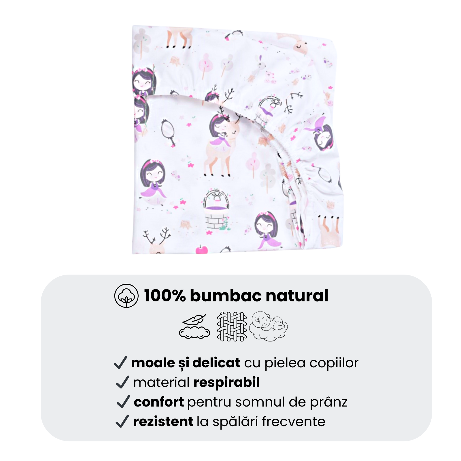 Cearsaful este realizat din bumbac 100% moale, fin, dens si foarte placut la atingere, oferind copiilor un somn linistit si odihnitor.