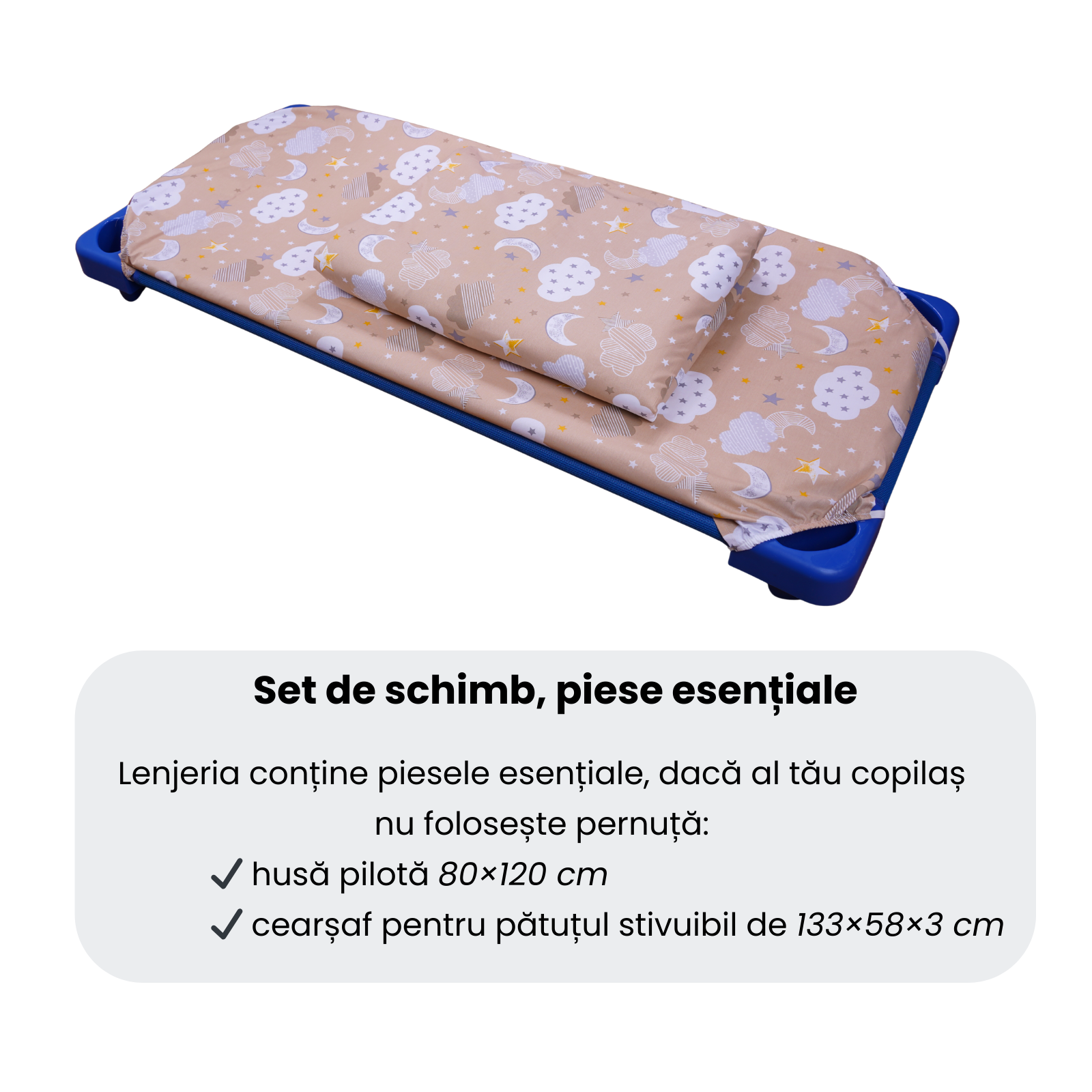 Set de lenjerie pentru grădiniță, format din 2 piese – husă pentru pilotă și cearșaf pentru salteluță – realizat din bumbac 100% și decorat cu un imprimeu delicat cu norișori maro. Conceput pentru pătuțuri stivuibile standard din grădinițe și creșe, setul oferă confort, rezistență și un design cald pentru odihna celor mici.