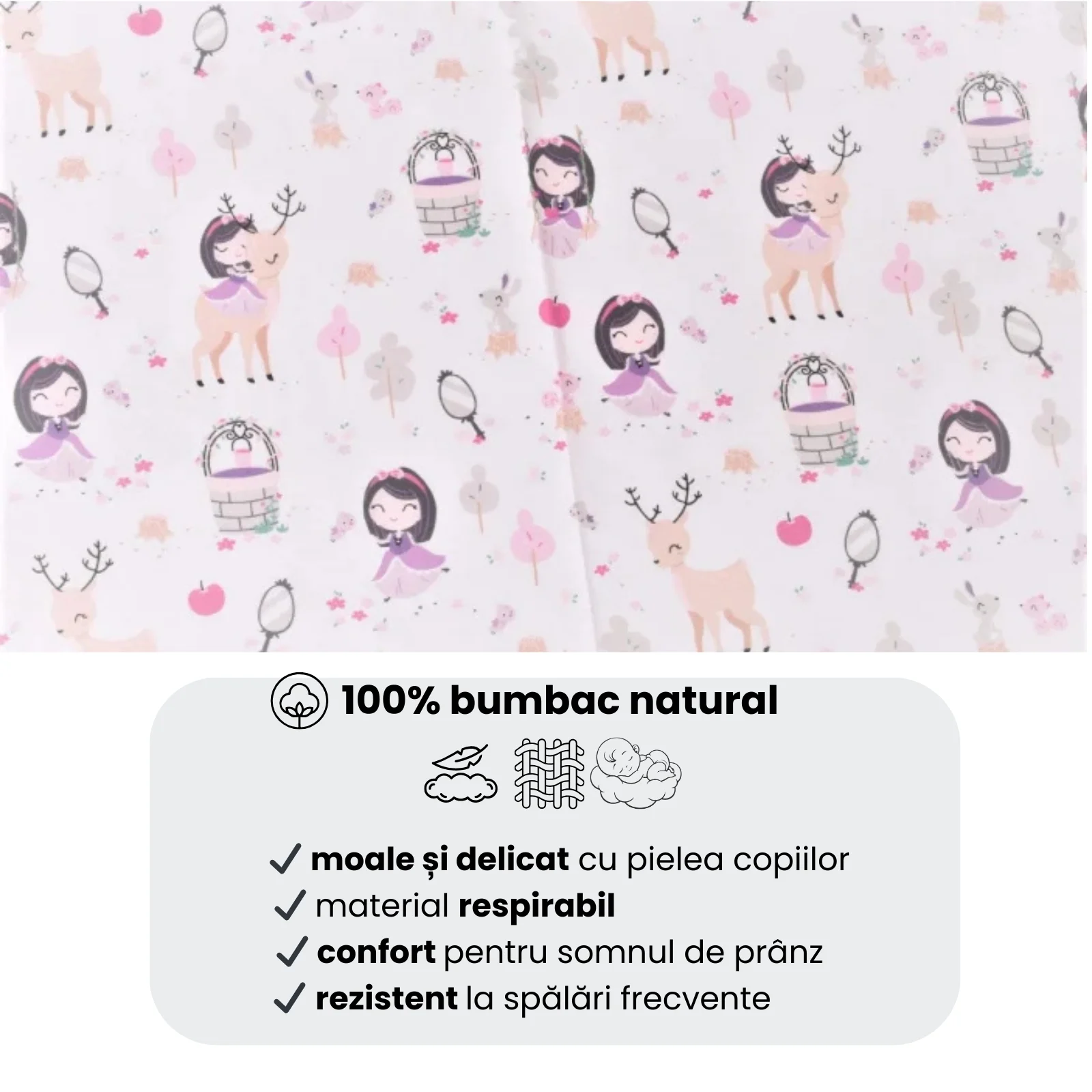 Modelul cu fetițe aduce un aer delicat și plin de farmec în pătuț. Imprimeul ilustrează personaje simpatice, în ținute jucăușe, surprinse în momente pline de gingășie, în nuanțe pastelate și armonioase. Designul este echilibrat și luminos, creând o atmosferă caldă și liniștitoare, perfectă pentru odihna din creșă sau grădiniță.
