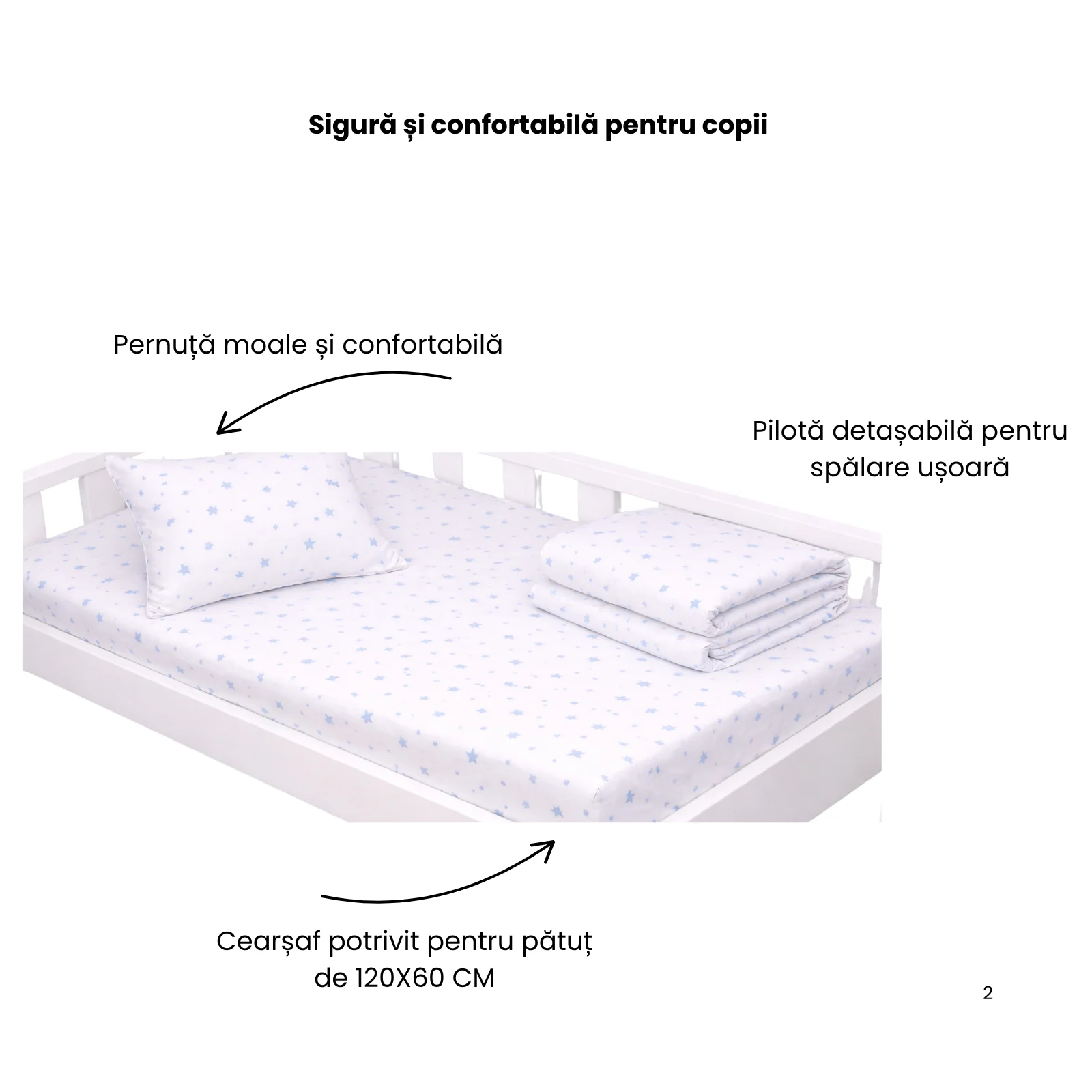 Lenjerie 3 piese pătuț 120x60 cm, creșă sau grădiniță, bumbac 100%, model Steluțe bleu