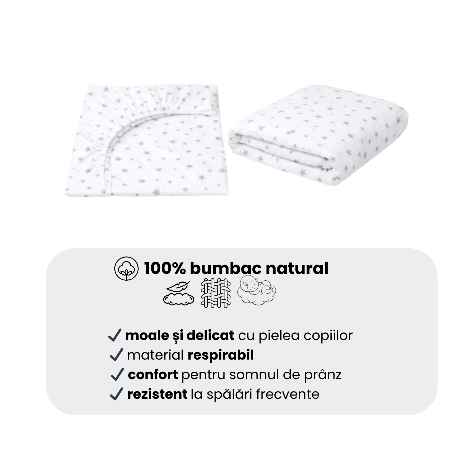 Modelul cu steluțe bleu aduce un aer liniștitor și delicat în pătuț, contribuind la crearea unui spațiu relaxant, ideal pentru odihna din creșă sau grădiniță.