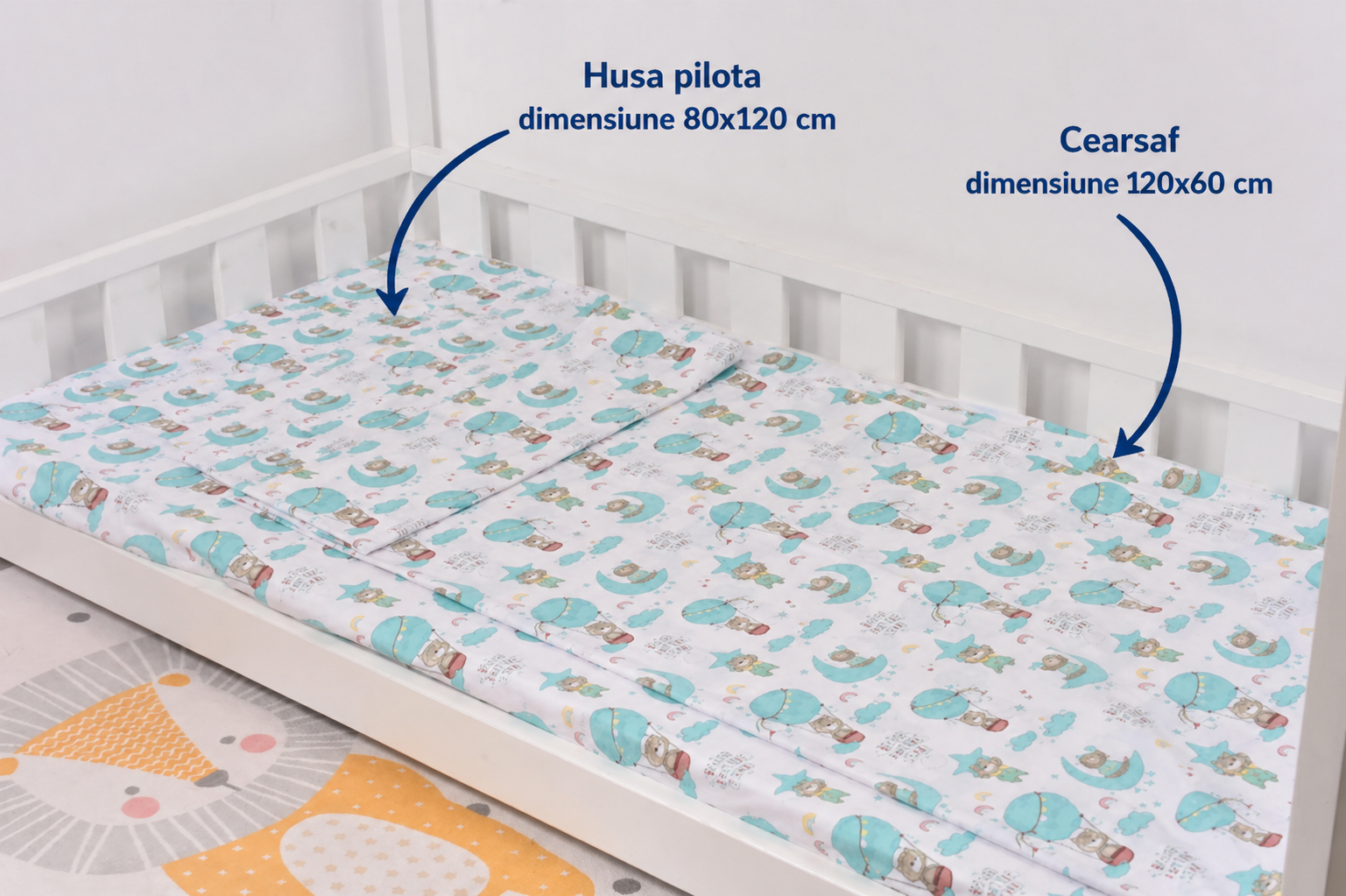 Setul include: husă de pilotă (80 × 120 cm) și cearșaf pentru salteluță (120 × 60 × 10 cm)