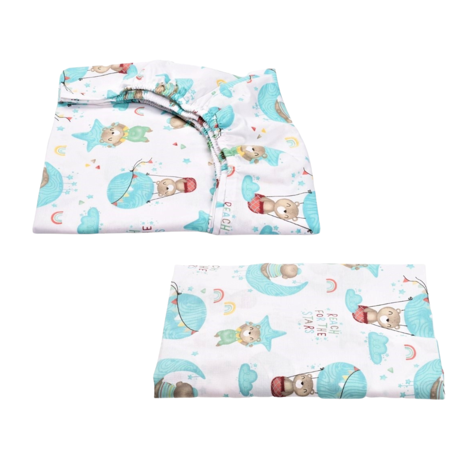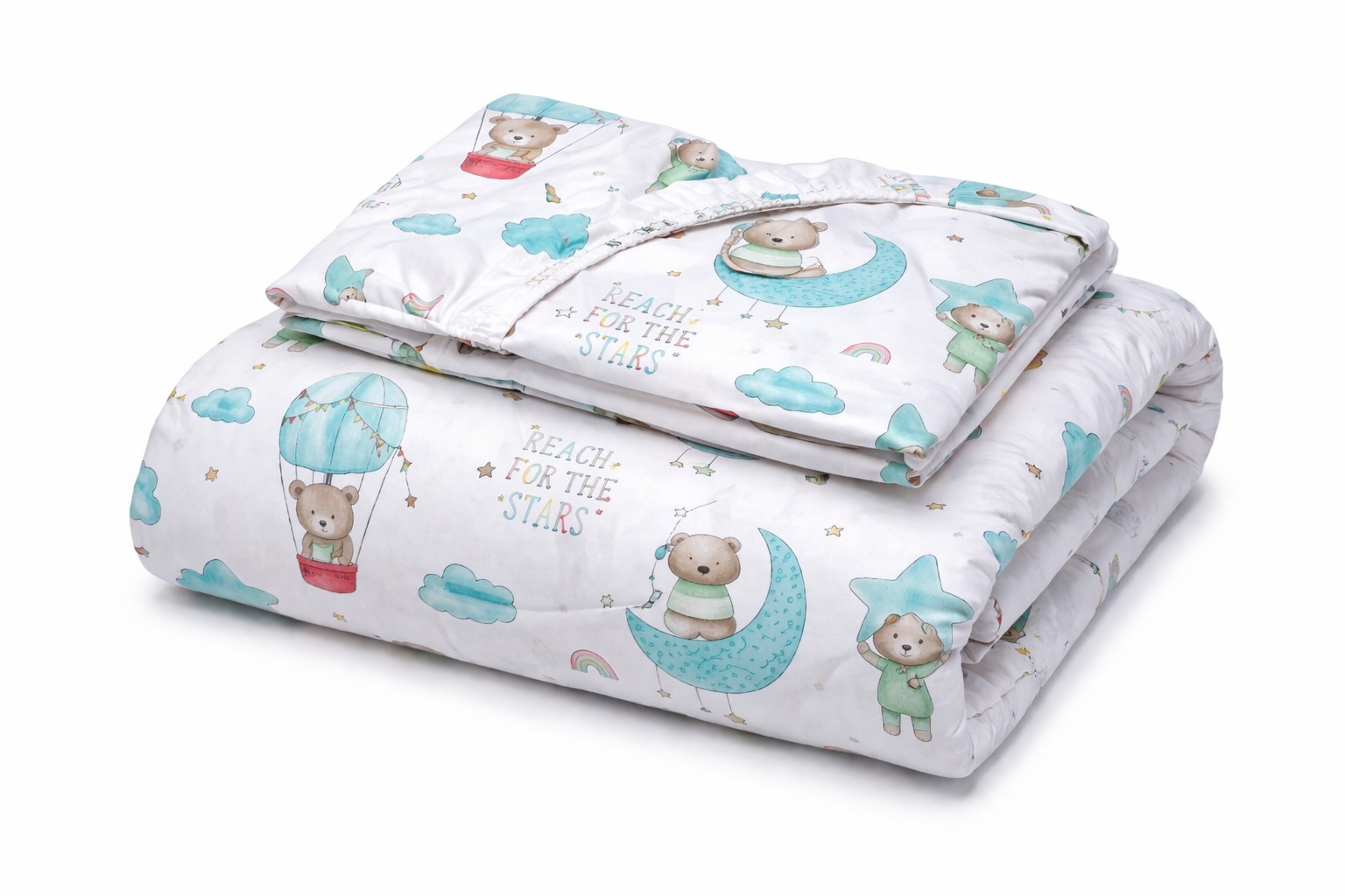 Designul jucăuș, cu ursuleți plutind printre nori, aduce un plus de farmec spațiului de odihnă și transformă fiecare somn într-o mică aventură.