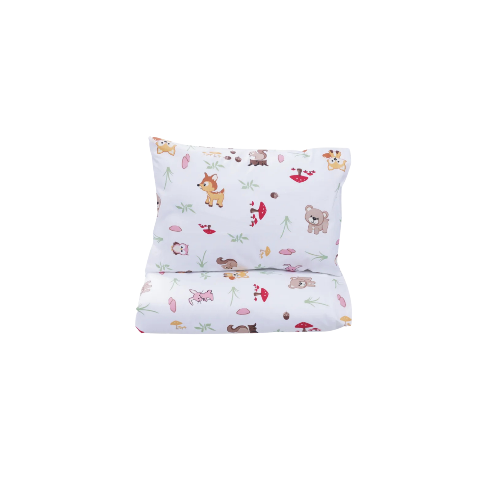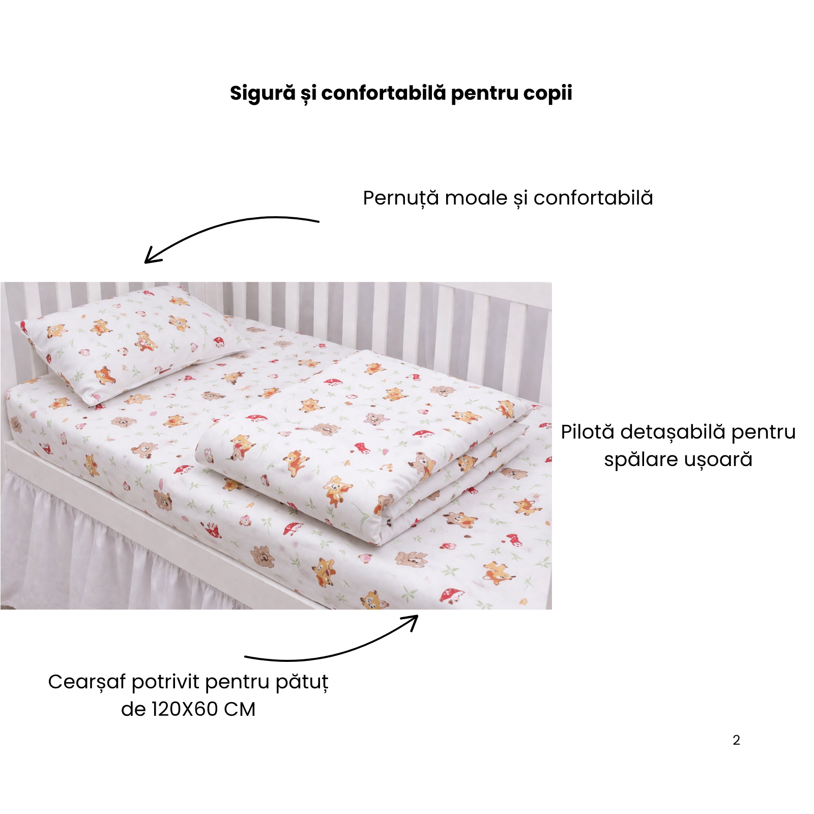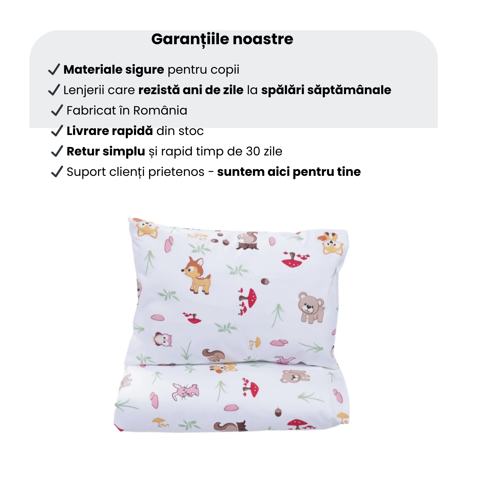 Lenjeria pentru pătuț de creșă este realizată din bumbac 100% de foarte bună calitate, fin, respirabil și plăcut la atingere, special ales pentru confortul celor mici. Modelul cu animăluțe și ciupercuțe creează o atmosferă veselă și jucăușă, inspirată din lumea poveștilor și a naturii. Ilustrațiile delicate aduc un plus de căldură și imaginație în spațiul copilului, transformând pătuțul într-un loc plăcut și liniștitor pentru odihnă.