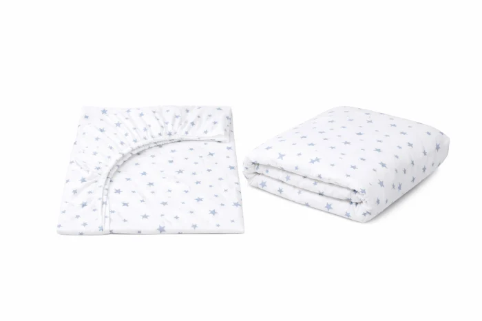 Lenjeria pentru pătuț de creșă este realizată din bumbac 100% de foarte bună calitate, fin și plăcut la atingere, în culori rezistente la spălări repetate. Modelul cu steluțe bleu este inspirat de cerul senin de noapte, presărat cu stele, creând o atmosferă calmă și liniștitoare pentru somnul celor mici.