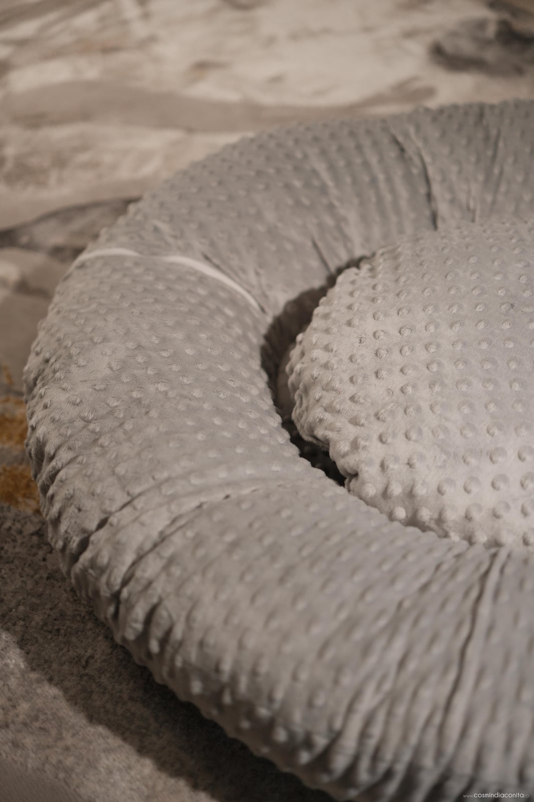 Fabricată din minky premium de 380 g/m², perna oferă o textură luxoasă și un plus de confort, susținut de umplutura din fibră poliester ce își păstrează forma în timp. Burduful de pe laterală este detașabil  astfel că perna poate fi spălată și igienizată cu ușurință in mașina automată.