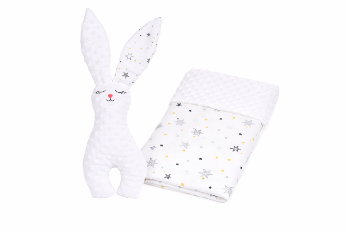 🐰 Include iepuraș textil moale și păturică pufoasă cu steluțe colorate