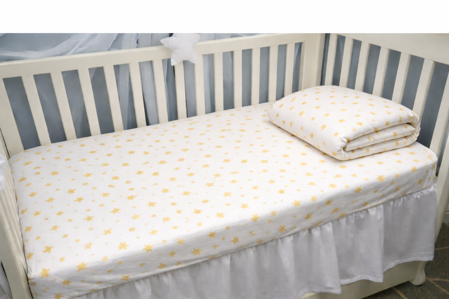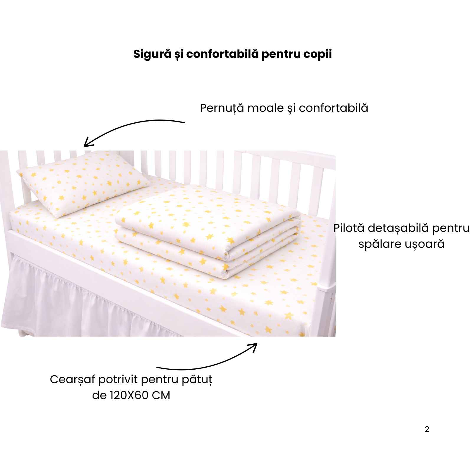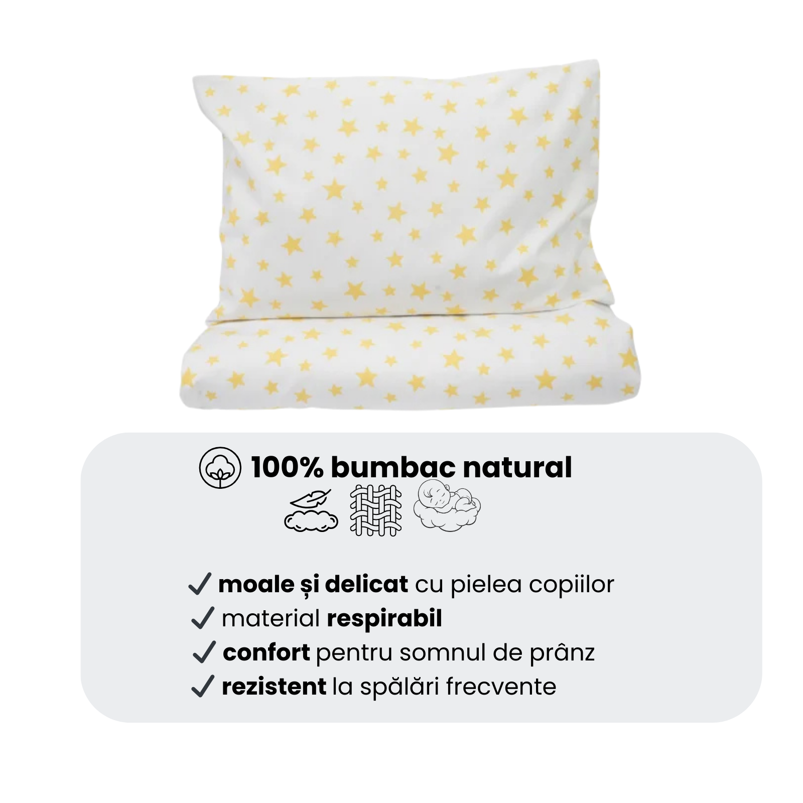 Lenjeria pentru pătuț de creșă este realizată din bumbac 100% de foarte bună calitate, fin și plăcut la atingere, în culori rezistente la spălări repetate. Modelul cu steluțe galbene este inspirat de lumina blândă a stelelor care strălucesc pe cerul nopții, aducând o notă caldă și veselă în spațiul copilului.