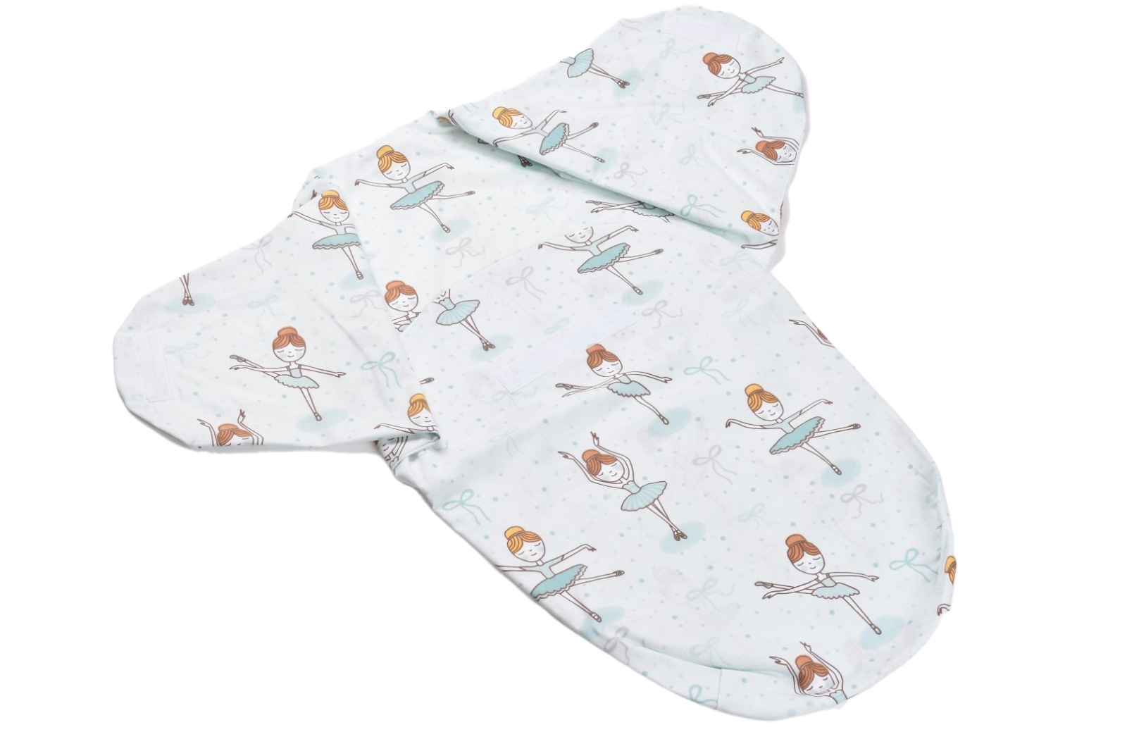 Sistemul de infasat model Balerine mici pe fond verde ii inveleste pe copilasi cu dragoste si ii ajuta sa  se adapteze la mediul extern cu blandete.